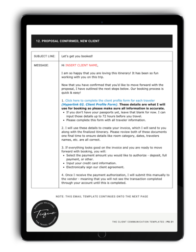 Our collections of email, forms, and task list templates will help you enforce boundaries, manage expectations, & deliver a high-end booking experience for your travel clients. Now available for TravelJoy, Tern, Travefy, and non-CRM specific users!
