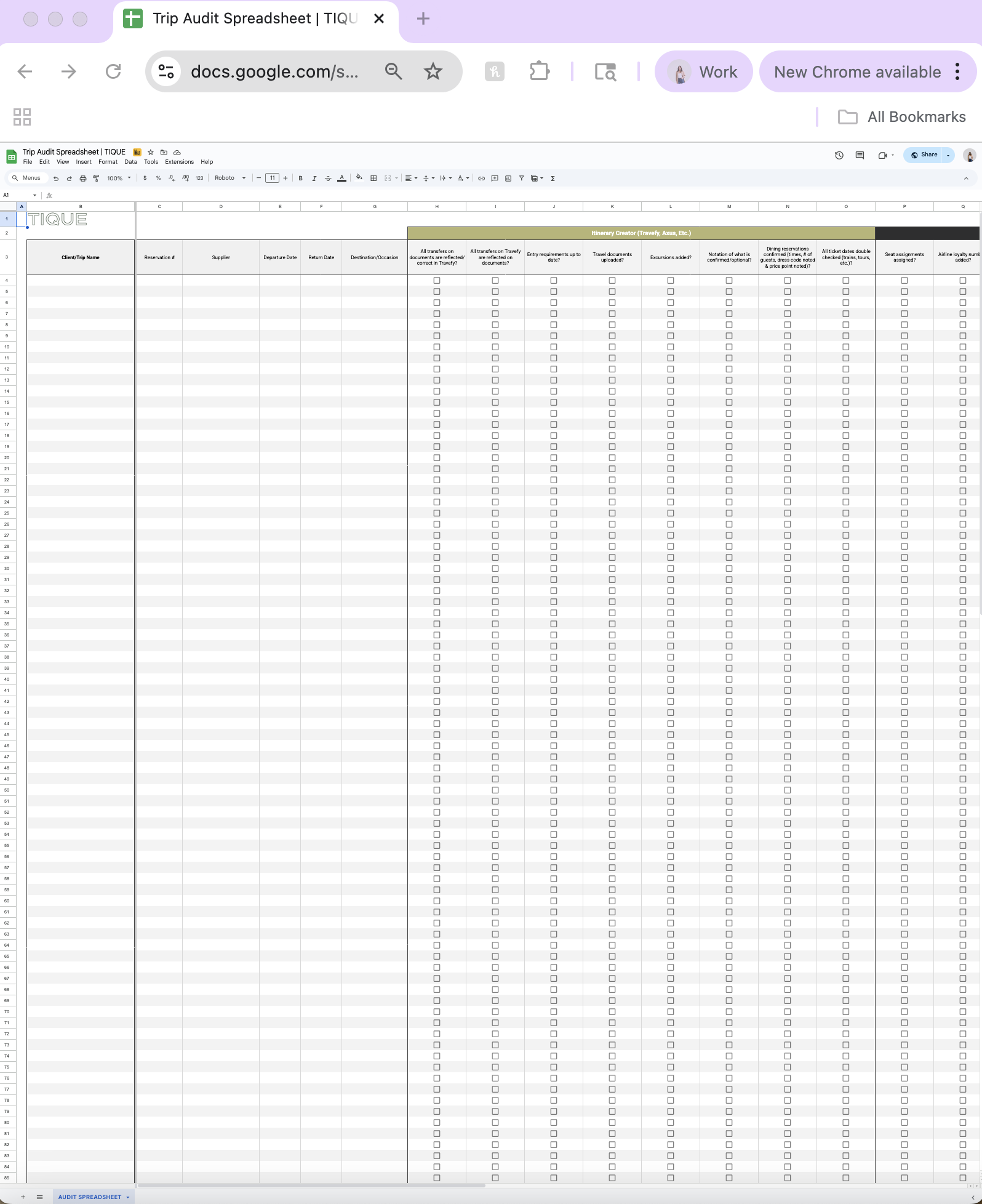 The Trip Audit Spreadsheet transforms your quality control process by providing a systematic, comprehensive checklist that ensures every single detail of every trip is reviewed, verified, and confirmed before your clients depart. This Google Sheets template includes 29 detailed checkpoint columns organized across four critical audit categories – itinerary systems, airline details, hotel confirmations, and administrative tasks. Whether you’re personally auditing trips or delegating to a VA, this spreadsheet creates accountability, catches errors before they become emergencies, and gives you documentary proof that due diligence was completed. It’s time to stop relying on memory and start using a proven system that protects your clients’ experiences and your professional reputation.